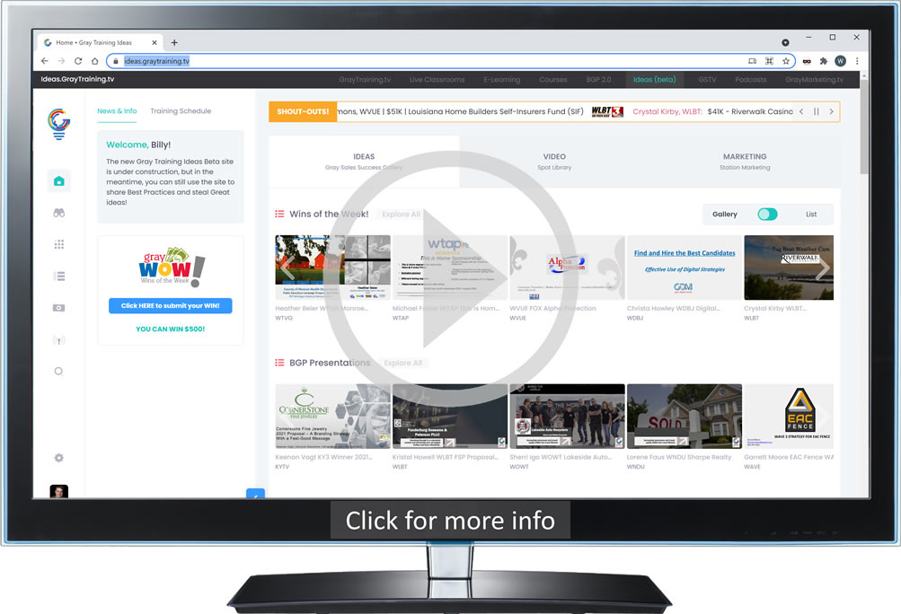 This destination allows you to quickly access a large number of success stories and best practices from around the Gray network. It's all about sharing success & modeling that success across all Gray stations! You have access to the best sales presentations in Gray. Why not steal some of those great ideas and make money!