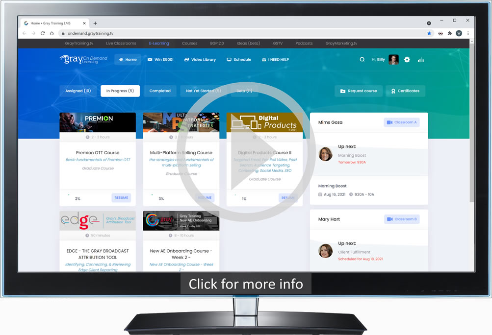 Gray Television and your local station believes that by investing in your sales career development, you will, in-turn, yield rewards not only for you financially, but also for Gray's revenue goals.